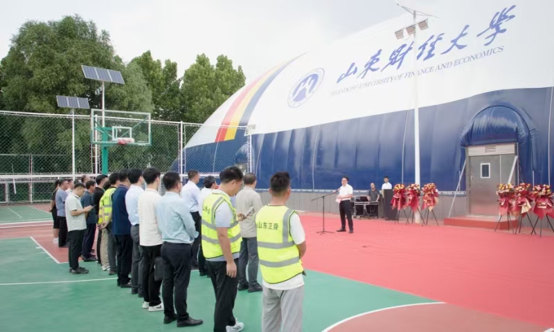 赵奎皓介绍了燕山校区体育馆建设情况。该馆位于校医院东北侧、艺术学院教学区南邻,采用双层气膜结构,建筑面积约1500平方米,投资268余万元。馆内共有9块标准羽毛球场地,地面为双层龙骨运动木地板,铺设PVC地胶地板,配备中央空调、新风系统、灯光系统、消防系统。此外还设有办公用房、男女更衣室、卫生间、淋浴间等,能够较好地满足师生的多元需求。